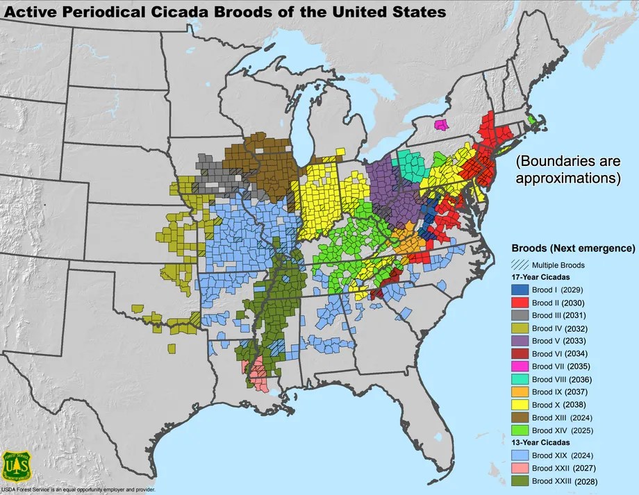 If you’re wondering when and where the noisy critters will arrive, Brian’s provided a map of the broods emerging in 2024 and over the next decade.