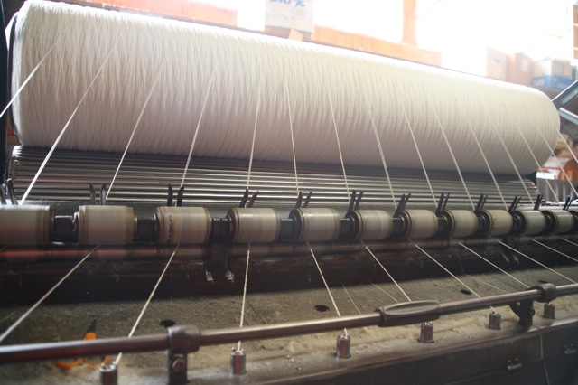 These are collected on large spools on the end of the card. They are then placed on spinning frames. Spinning puts the actual twist on the roving, turning it into yarn.