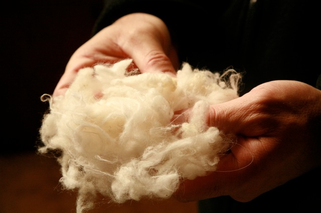 The clean wool is fed into the picker, which separates the locks into loose fibers, fluffs them out and adds spinning oil. The oil acts like a conditioner to prevent the fibers from tangling and breaking. It then goes to the four breaker, 60 inch Davis and Furber woolen card, manufactured in 1905. The card untangles the individual fibers and reduces the sheets of wool into small strips called pencil rovings.